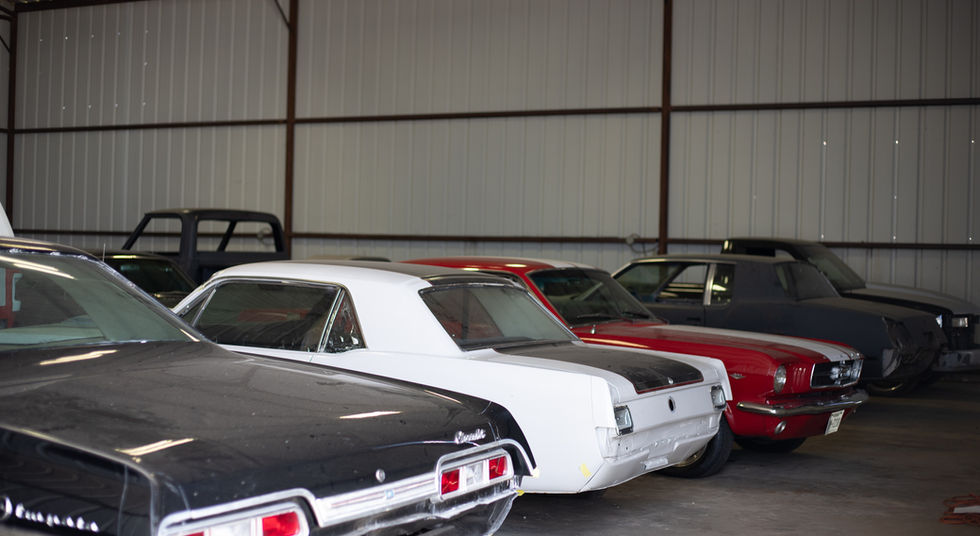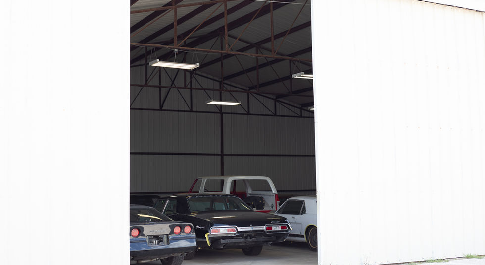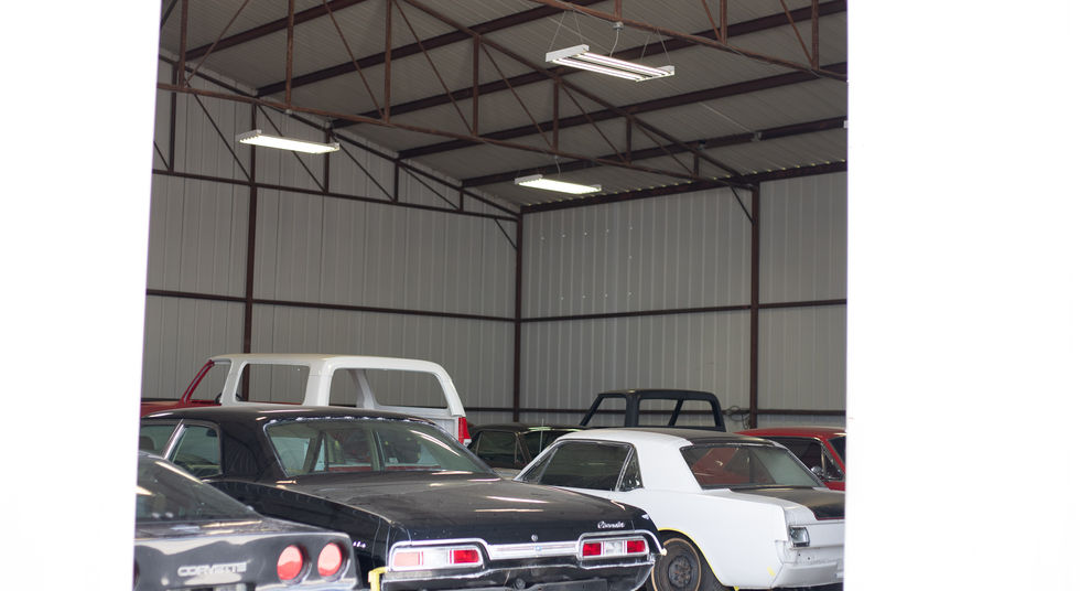 Áreas cubiertas para vehículos que esperan servicio o el siguiente paso del proceso de construcción y un pasto verde donde se almacenan los autos parciales, así como grandes remolques conex de gran tamaño para el almacenamiento a largo plazo de piezas, por nombrar algunas de las otras áreas de las instalaciones.